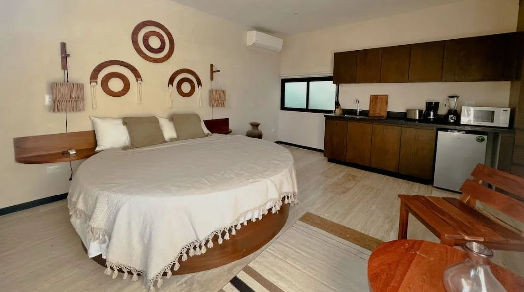 Share this chic boho studio bedroom equipped with a single circle queen-sized bed, private bathroom, patio with chairs, small kitchen with mini-fridge, dishware, and a microwave with a friend.